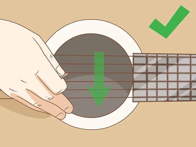 吉他常用的调弦法是将⑥⑤④③②①六根琴弦的音高按乐音体系中的乐音分别校定为:⑥弦一E(低音E),⑤弦-A,④弦一D,③一G,②弦一B,①弦一E(高音E),即简谱c调的3(低音Mi)、6(La)、2(Re)、5(Sol)、7(Si)、3(高音Mi)各弦之间形成三、四度音程关系。当按照上述要求将琴弦调校后,乐音便自然地排列在各个品格上了。
